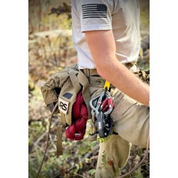 For transport, the Entropy Bag comes with two utility straps, one short for Thigh/Leg mounting and one long for Shoulder/Fanny Pack mounting. These straps can be used in conjunction with the loops on the back of the bag to facilitate the various carry options.