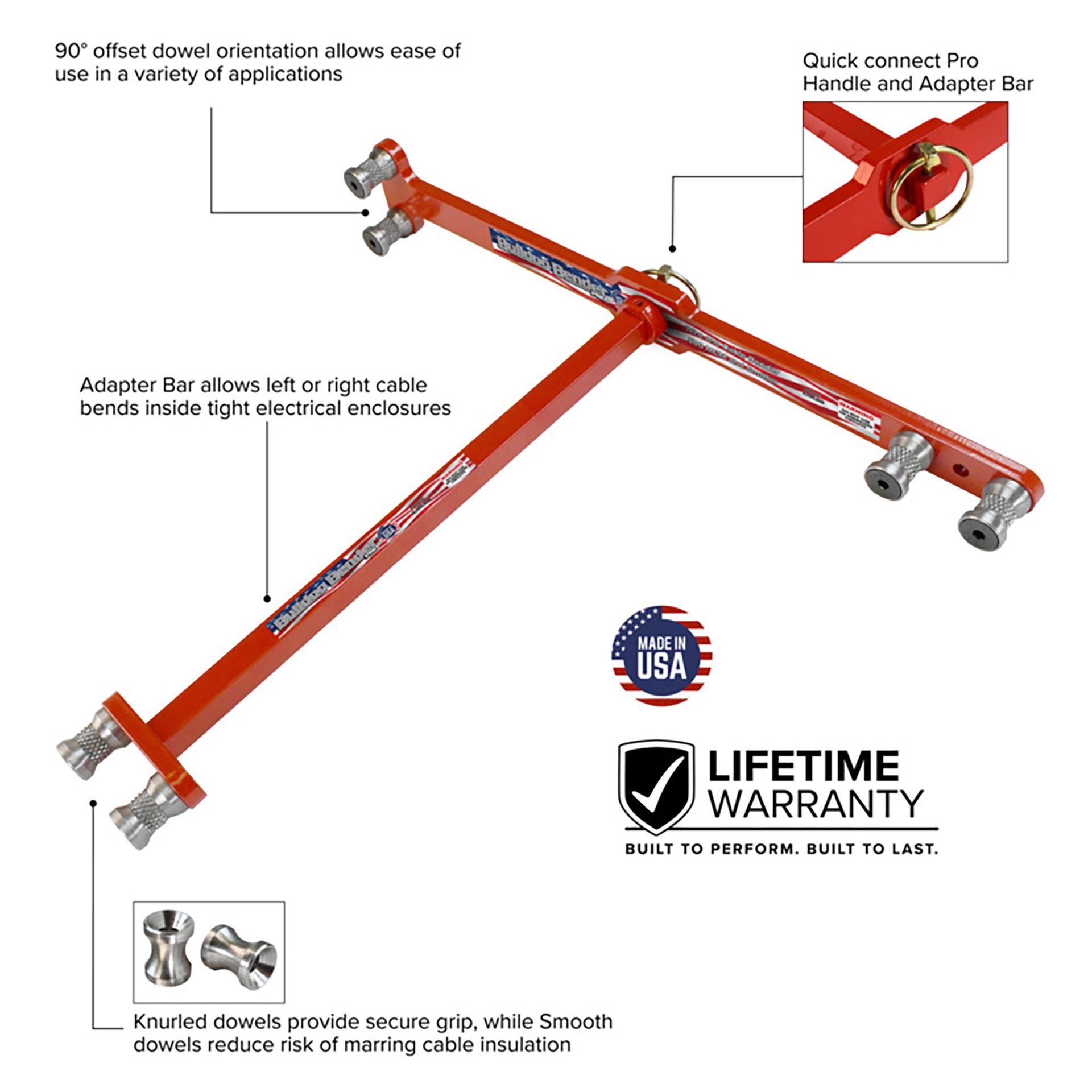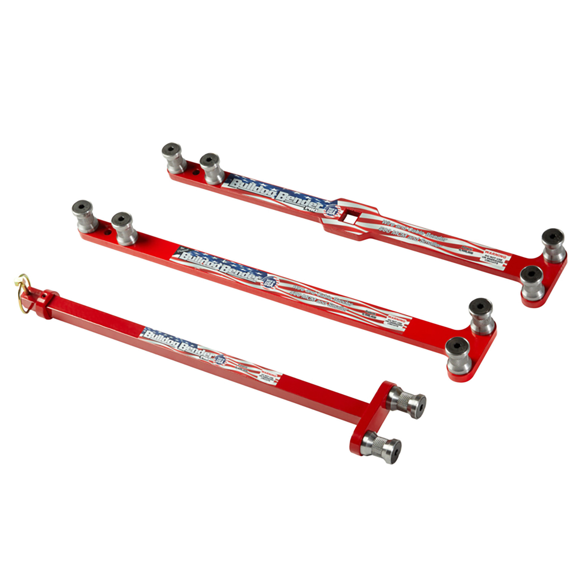 The Bulldog Bender Original Sets include five tools designed to handle cables up to 1000 MCM, with optimal performance for bending and terminating cables 500 MCM and smaller in tight spaces. Available in two configurations: the 2-Piece Set with an 18″ Pro Handle and 15″ Adapter Bar, and the 3-Piece Set featuring both an 18″ Standard Handle and 18″ Pro Handle with Adapter Bar—each set includes both knurled and smooth dowels for user preference and is backed by a lifetime warranty.