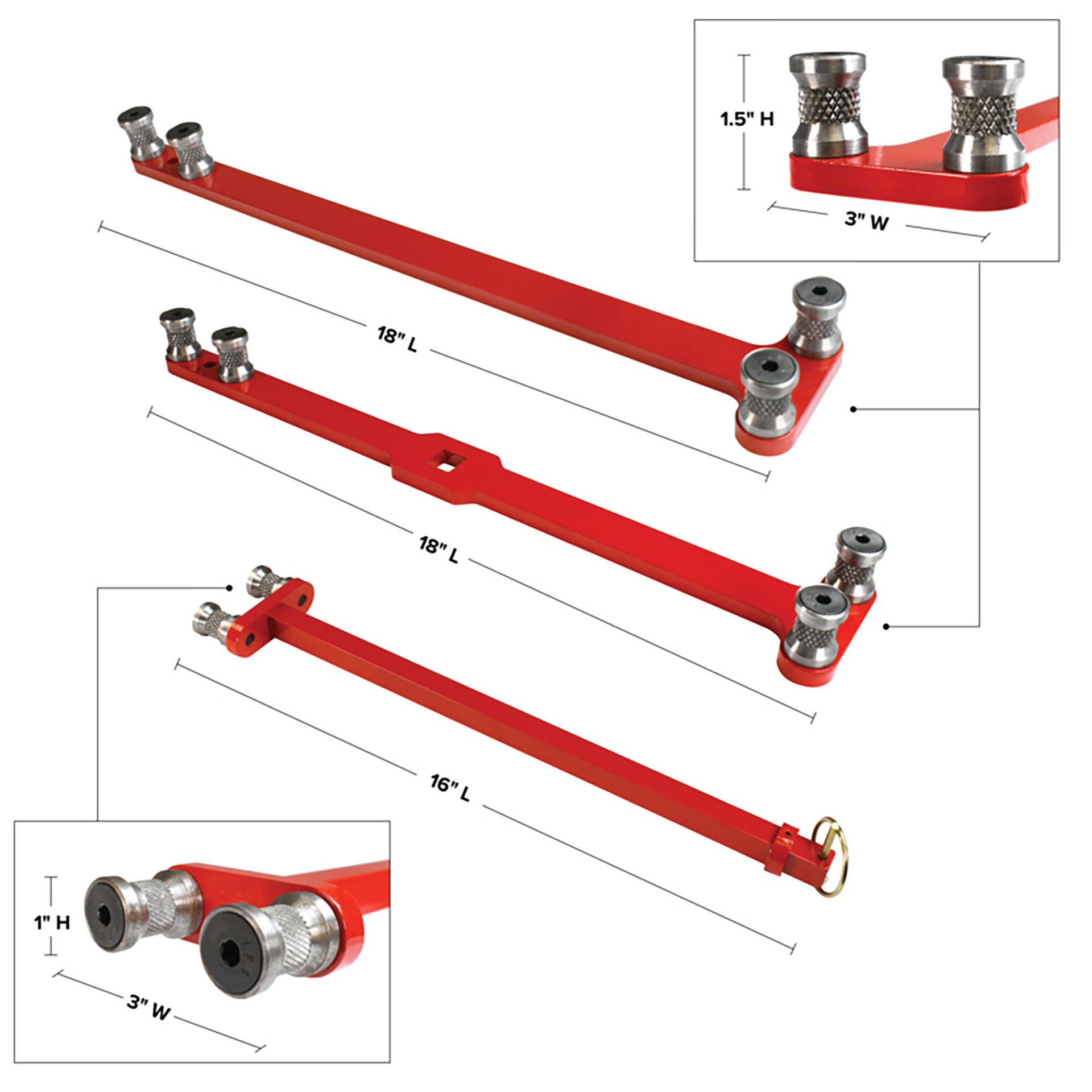 - 3-Piece Set: 18″ Standard Handle (Knurled Dowels 2.6 lbs., Smooth Dowels 2.5 lbs.), 18″ Pro-Handle and 15″ Adapter Bar
