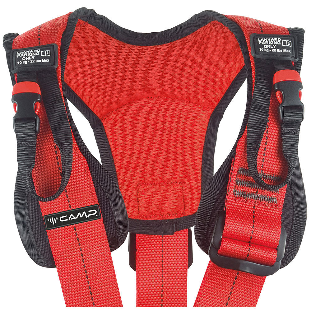 Patented ventral attachment features two loops: the upper loop is for attaching a chest harness and chest ascender and the lower loop holds the ventral D-ring for attaching lanyards and rope tools.