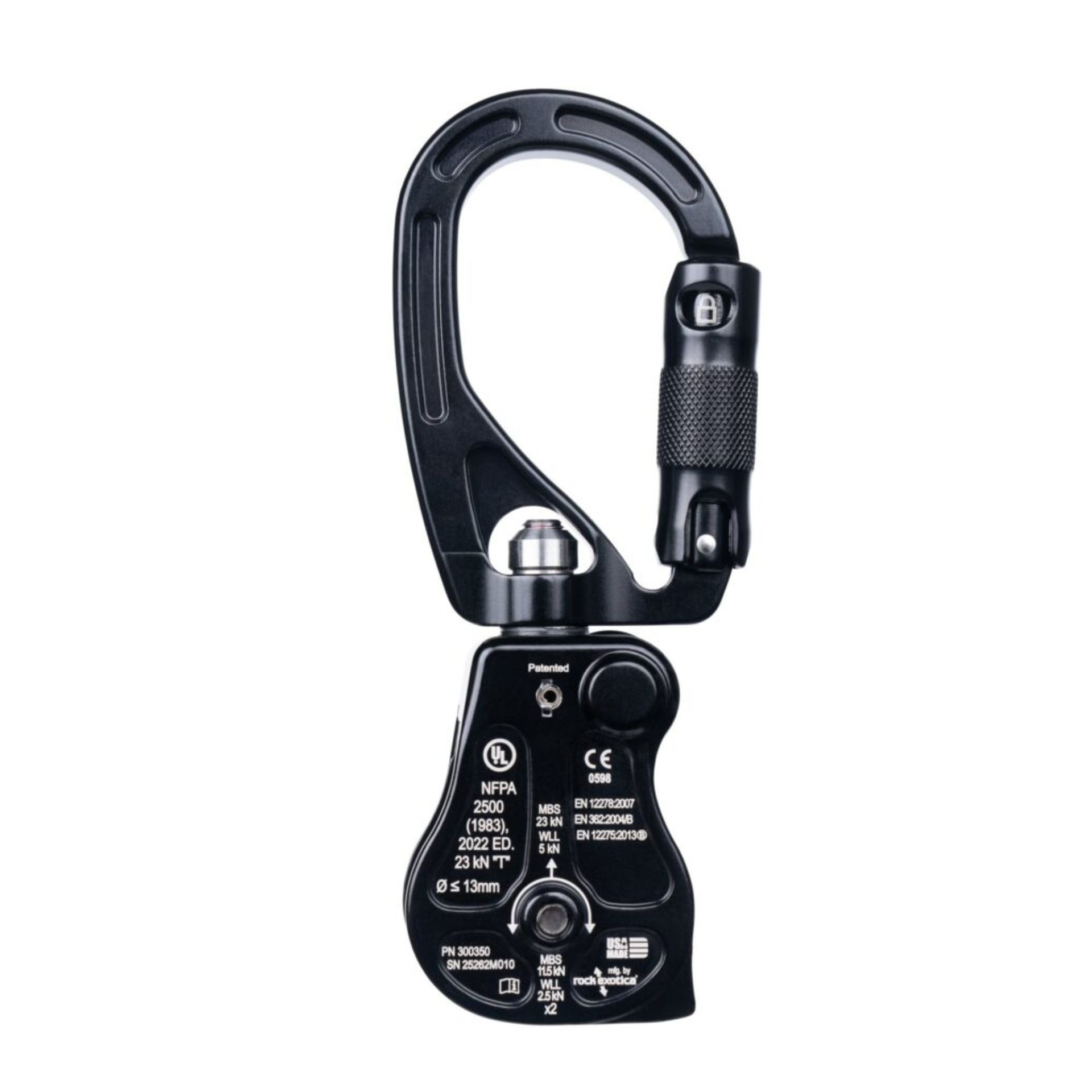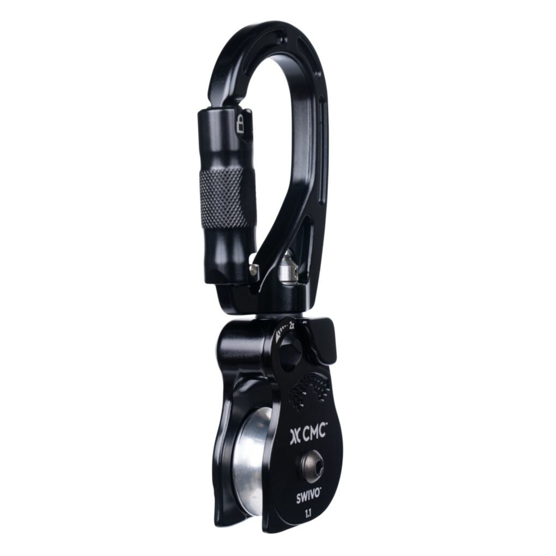 - Combines a swivel, pulley, and oval carabiner in a single device