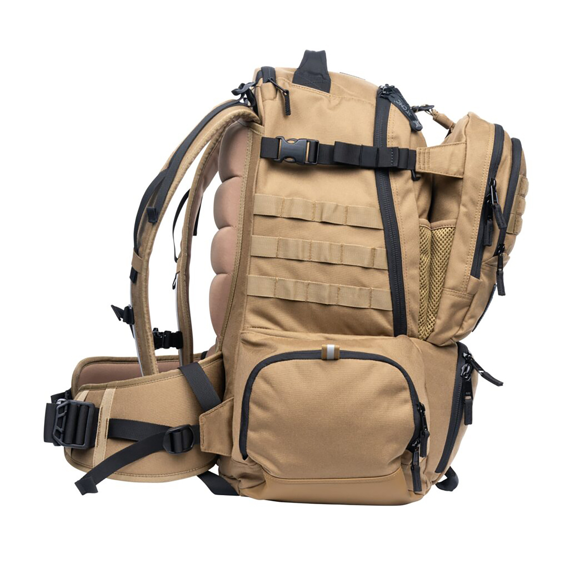 This pack includes a built in rainfly and ground cloth, stored in their own compartment, keeping them out of the way until needed. A separate fleece lined pocket stores googles or glassed and prevents scratching.