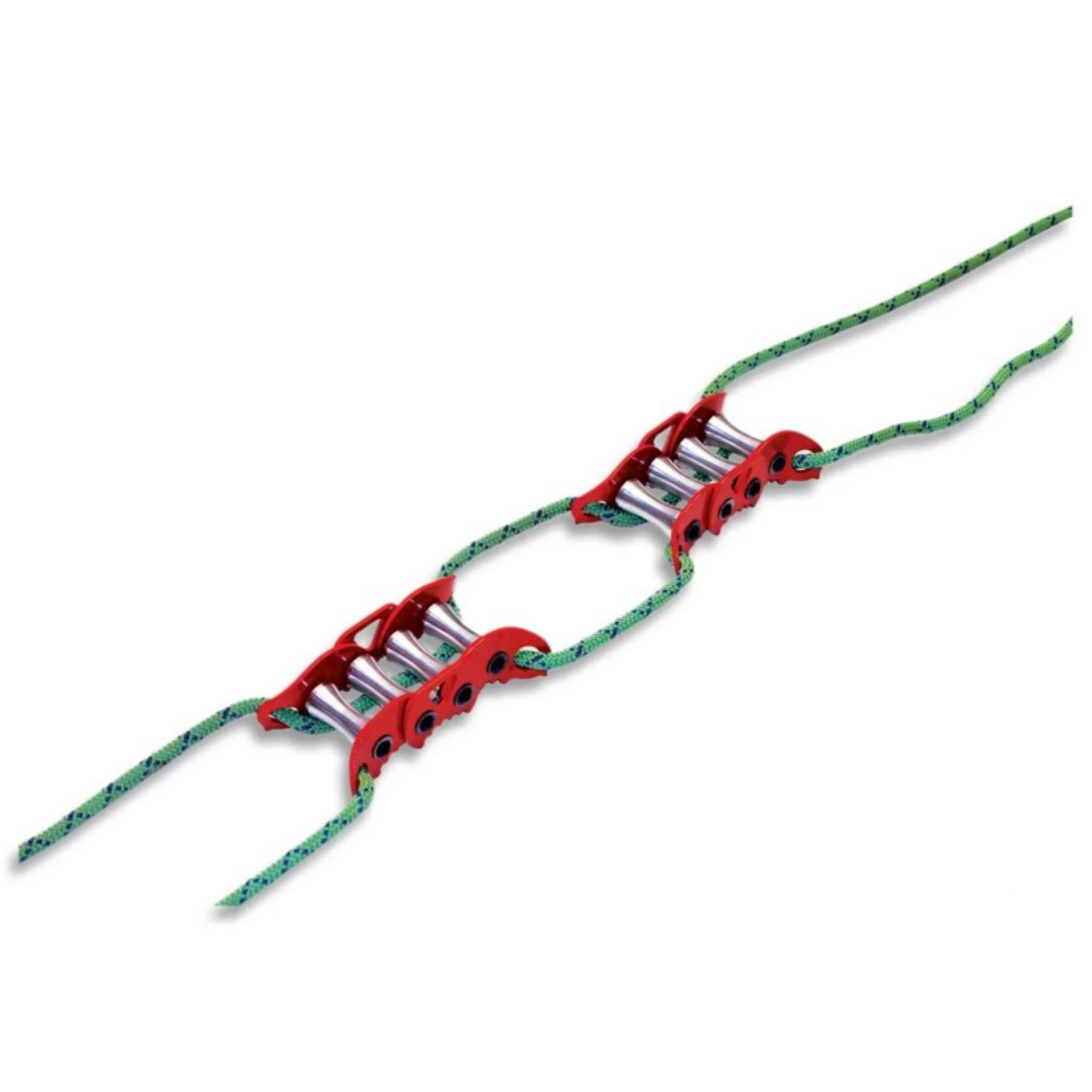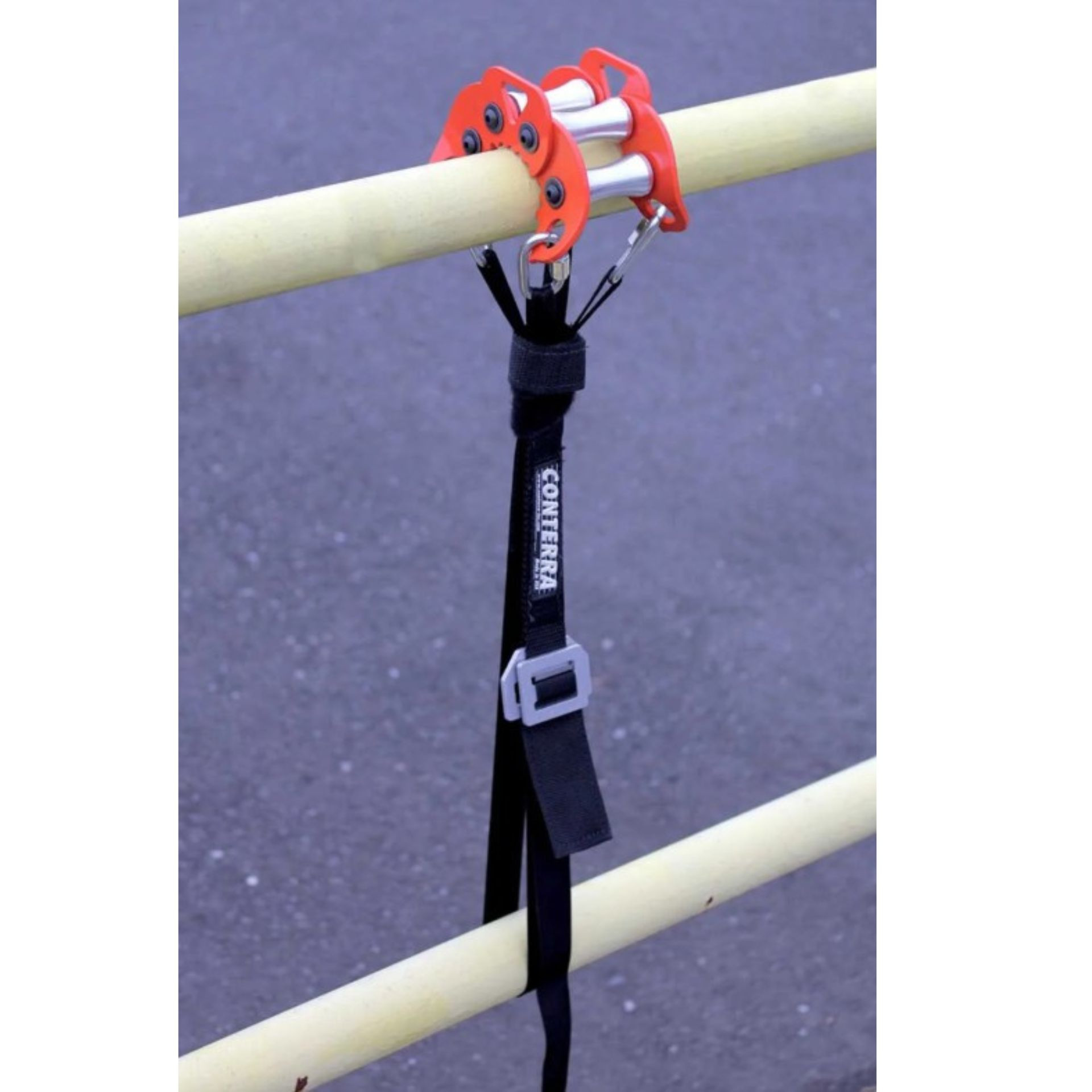 The Clampbot can be placed with 8mm cord, just like the Edgebot, as well as having the capability of redirecting the rope with a carabiner. The truly great feature of the Clampbot is its ability to “grasp” thin railings when used with the Rail Roller attachment. The Clampbot is built with eight Oilite bronze bearings over stainless steel axles, with hourglass shaped aluminum tires. Despite these features the Clampbot is still crazy light, and fits in the palm of your hand. The powder coated, articulating side plates are also aircraft grade aluminum. Built in house, in Conterra's own ISO 9001 certified machine shop to guarantee you absolute top quality and dependability.