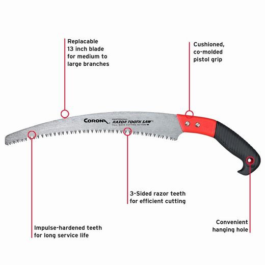 The classic 13" pruning saw from Corona has been used by thousands of professional arborists. Cuts quick and efficiently. Scabbard is sold separately.