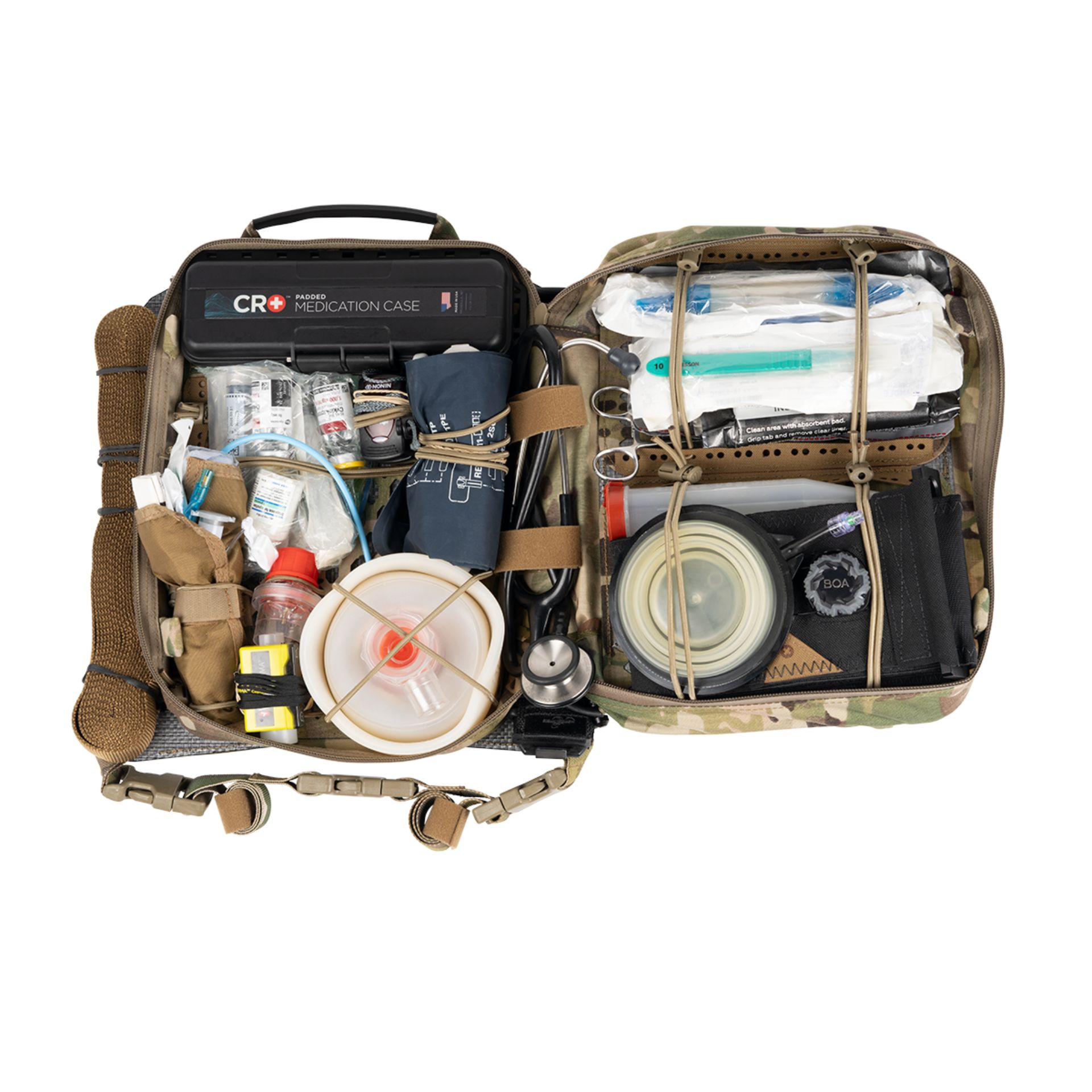The CRO Damage Control Resuscitation (DCR) 7L is designed to optimize the delivery of the first unit of blood at the point of injury (POI) before entering into a massive transfusion protocol. This slim bag is designed to carry diagnostics, access, and a single unit container, as well as POI drugs in a tiered load-out. The first-line MARCH belt is recommended for use with this product. This product does not come stocked.