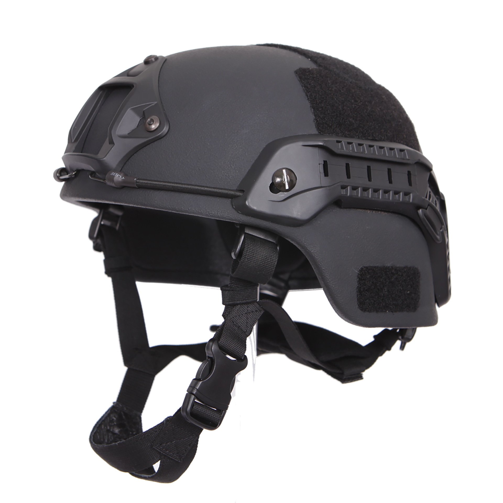 It features integrated picatinny side rails, a front NVG mount, bungee cords, and external Velcro for attaching lights, cameras, night vision, and patches. Lightweight, comfortable, and highly adjustable, it includes a removable padded interior and nylon suspension system for a secure fit.