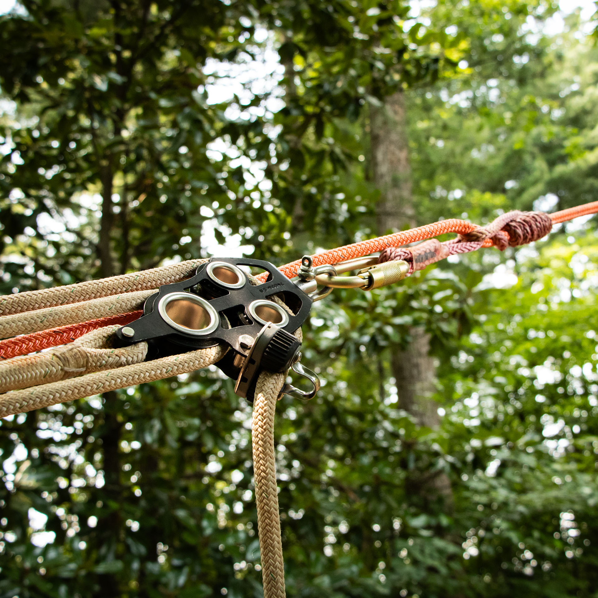 These high-strength blocks are ideal for pre-tensioning lines or lifting heavy objects. Fiddle blocks are easier to deploy than our tree pulling kit (especially for beginners) because the system is applied on top of a host line instead of involving threaded host line. Fiddle blocks are generally stored fully rigged so that you simply attach the ends to host line (via the included Prusik) and anchor (a tree, vehicle, or even host rope again, using the included carabiner on your sling or other means). The fiddle block’s limitations are that it’s limited to 10 feet of working spread with the included (50-foot) rope; a friction device (like Portawrap) is required to hold drawn rigging line for multiple advances if needed