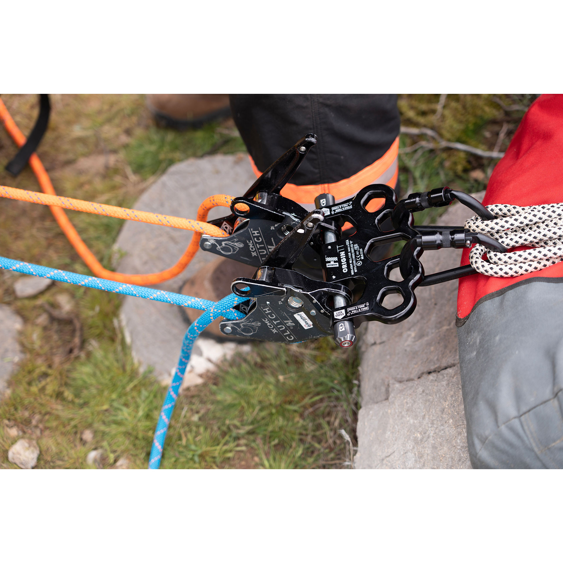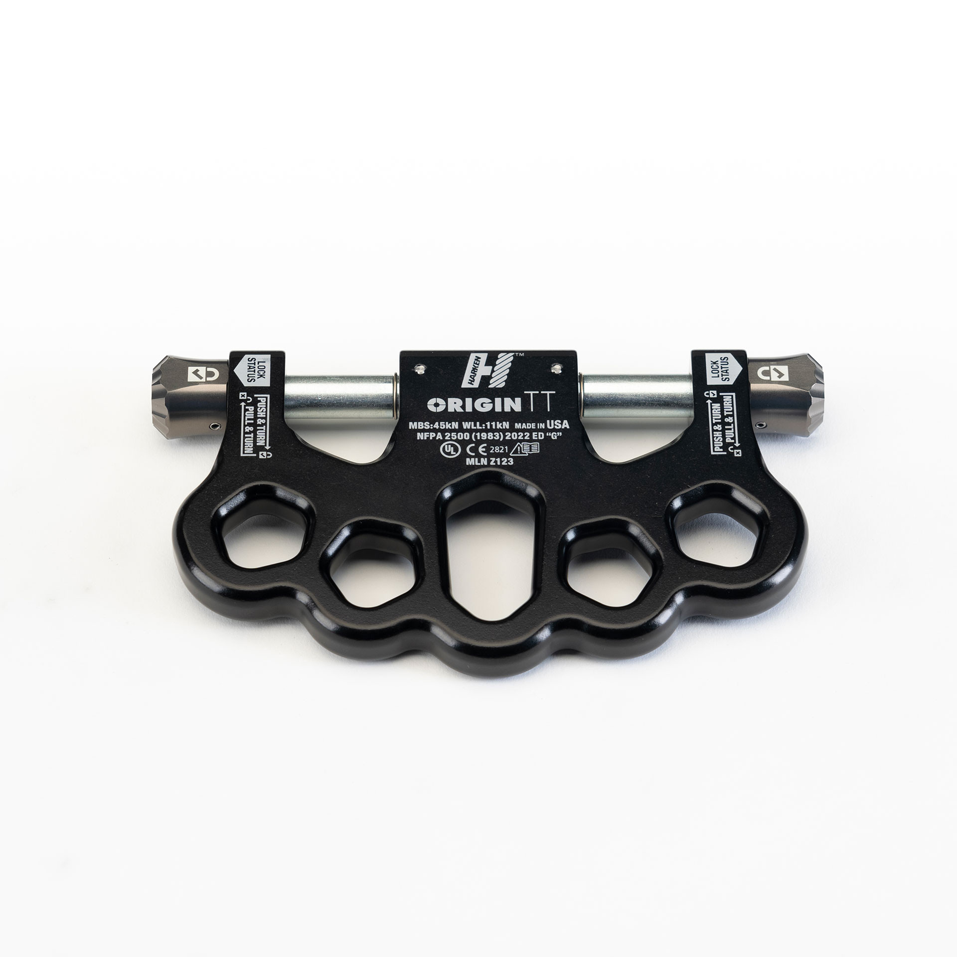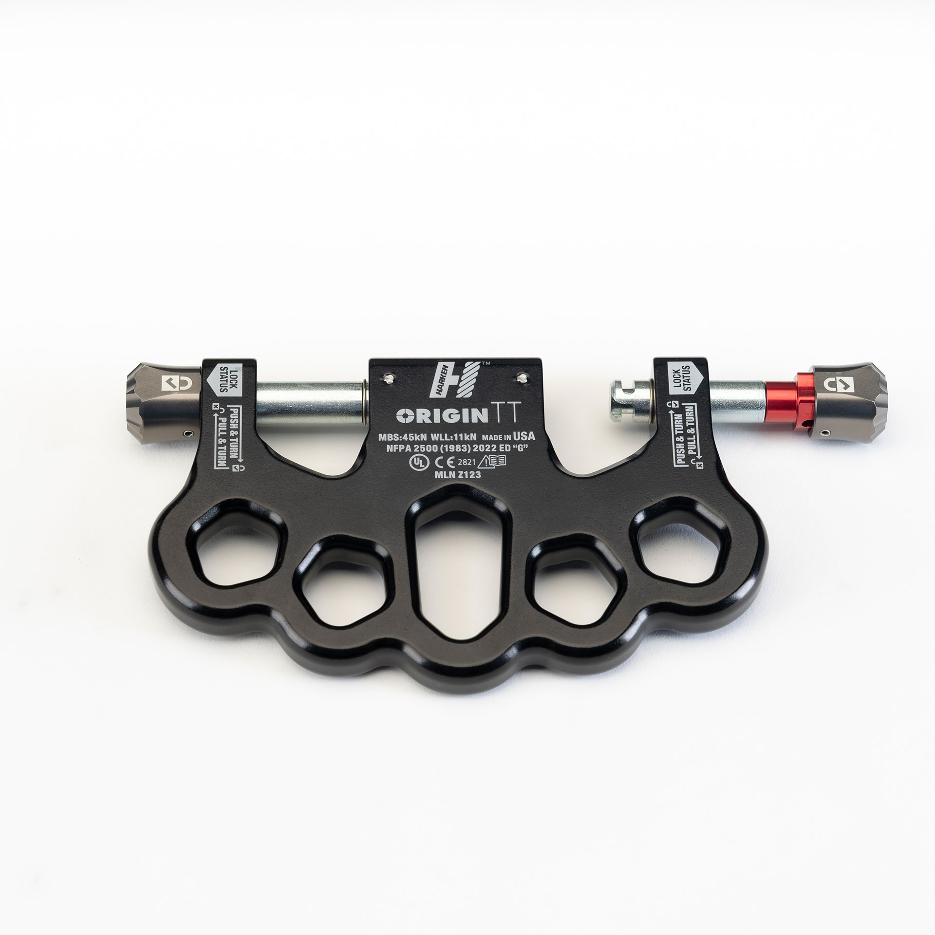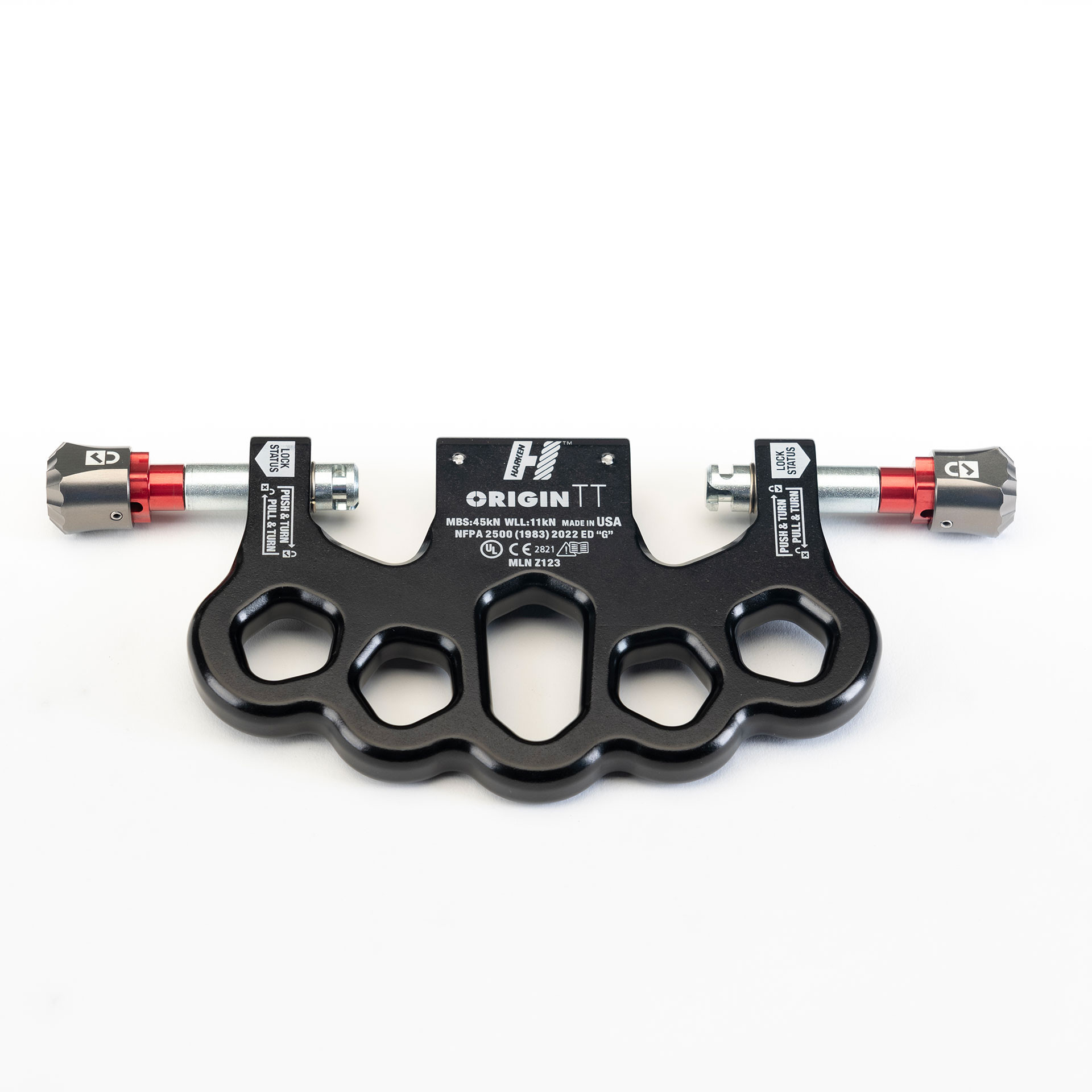 Unlike rigging plates that use a single bolt system to mount two side-by-side multi-purpose devices, Origin TT employs two quick-release locking pins. This enables independent attention to either of the twin devices managing ropes in the system, while the other remains safely tensioned. And set-up is simply easier. On the raise/lower side, Origin TT provides a seamless link with Harken Clutch and similar multi-purpose devices from other manufactures, eliminating the need for carabiners and shortening overall system length. There are five attachment points on the anchor side which enable rigging of ‘SERENE’ systems (Systems Strong, Equalized, Redundant, Efficient with No Extension potential.) Eliminating carabiners also removes play in the system that can diminish coordination between the two lowering devices which remain immediately adjacent and aligned. This facilitates the coordinated precision that results from the dual-handled operation (Sharkfinning) where Origin TT excels. Lowering happens at the same pace on each device, greatly diminishing uncomfortable jerking for the humans at the end of the line. The connected devices stay better synchronized and better aligned with the load on hauls which become more efficient as well.
