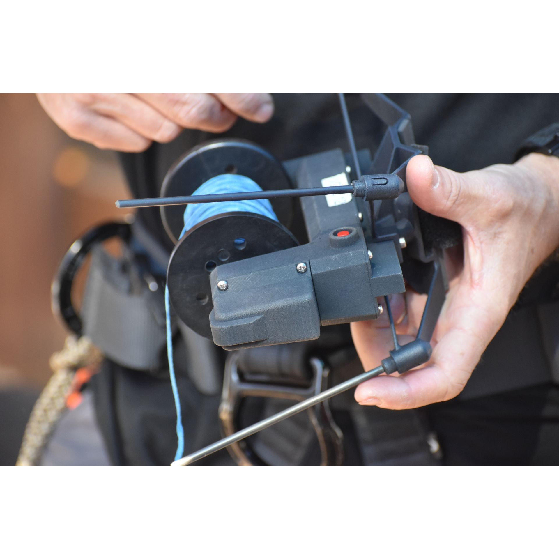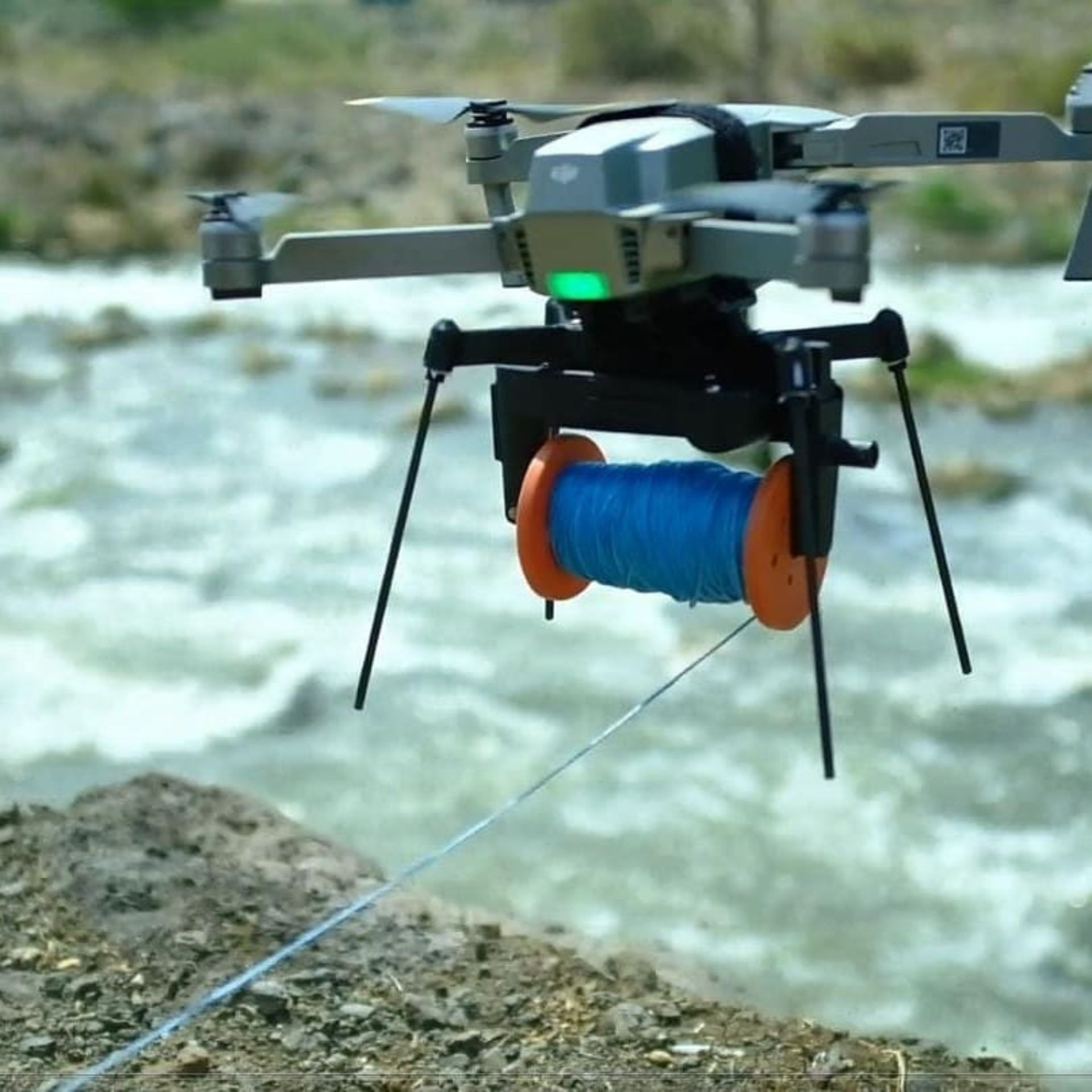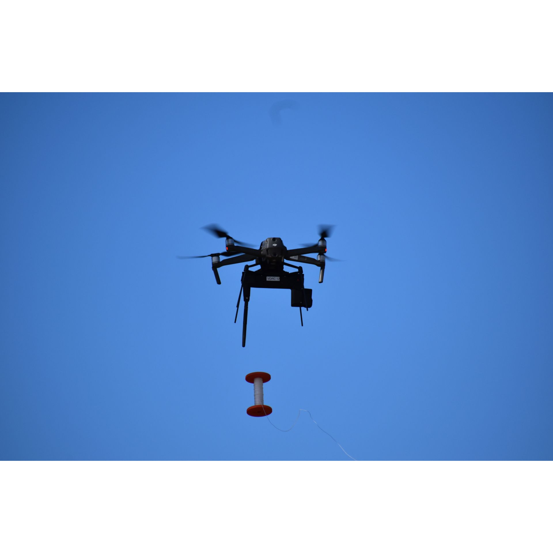 This system mount to nearly any drone, and allows it to carry a spool of up to to 200 m of 1 mm Dyneema cord. When the line is in place, the remote control allows it to release the spool and continue its flight. This allows for easy deployment of a pull line to tall buildings, trees, towers, or across rivers.