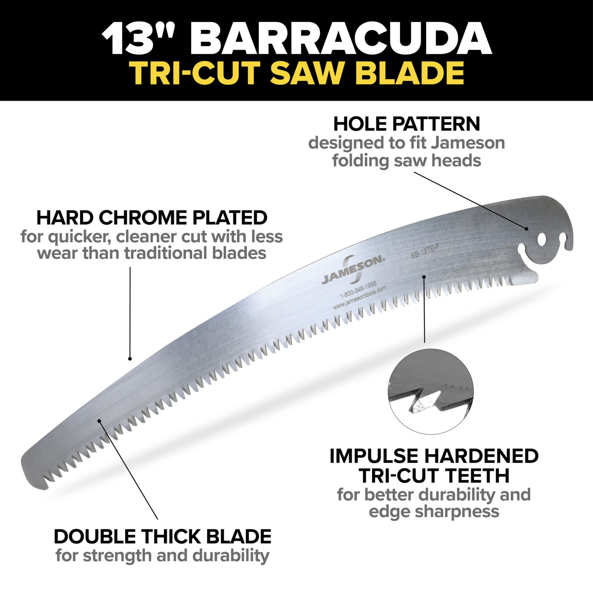 Engineered for professional performance, the Barracuda Tri-Cut blade delivers faster, cleaner cuts with less effort and reduced wear. Its hard chrome-plated finish and precision tri-cut teeth ensure a long-lasting, razor-sharp edge—ideal for arborists and homeowners tackling tough limbs. The 13-inch blade slices through dense branches with ease, making it a reliable tool for demanding cutting tasks.