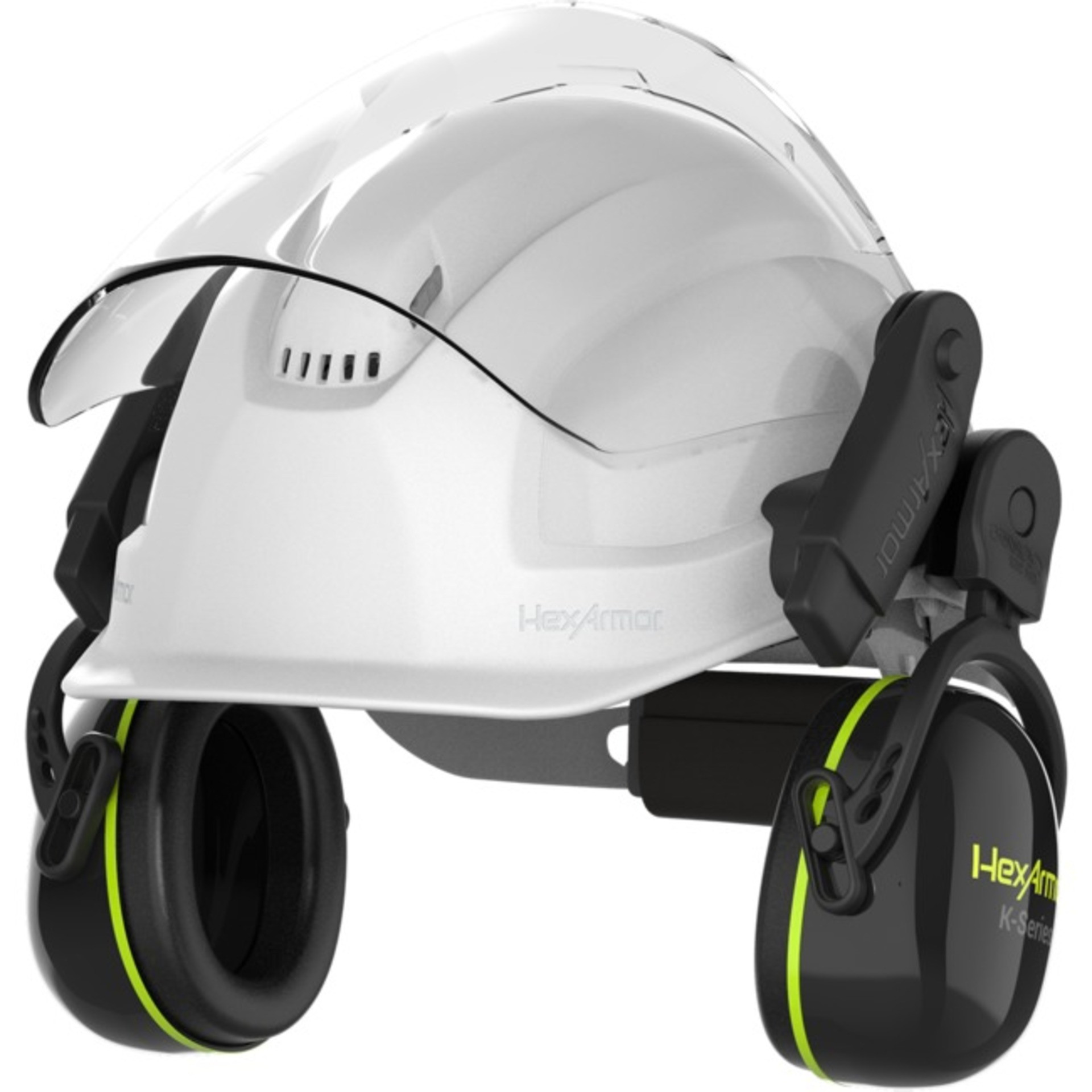 The K2M mechanical earmuffs deliver a noise reduction rating of 25 decibels and can be used alongside the magnetic face shield on your Ceros® safety helmet.