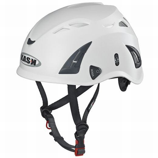 The chin strap is designed with four fasten points to reduce risk of helmet loss from impact (breaking strength more than 50 decanewtons, or 112.4 pounds; CE EN 12492 mountaineering helmet standard). Kask’s safety release system allows for quick fastening and unfastening. Soft polyethylene side retractors regulate strap length for various head shapes. The red-colored ring on one of the straps is provided for fastening the helmet to a harness. The lamp-carrying clips, made from sturdy nylon 6.6, are compatible with most strap-type headlamps.