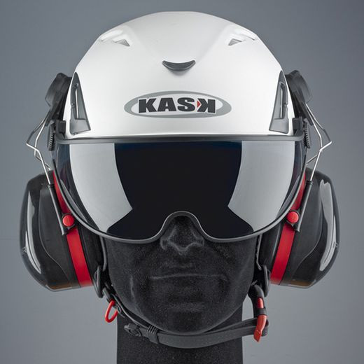Both the 3M Optime 105 Earmuffs ( part # 33288) and the 3M Hi-Viz Cap-Mount Earmuffs (part # 15820) will fit this KASK helmet when used with the brackets that come in the box with the helmet.