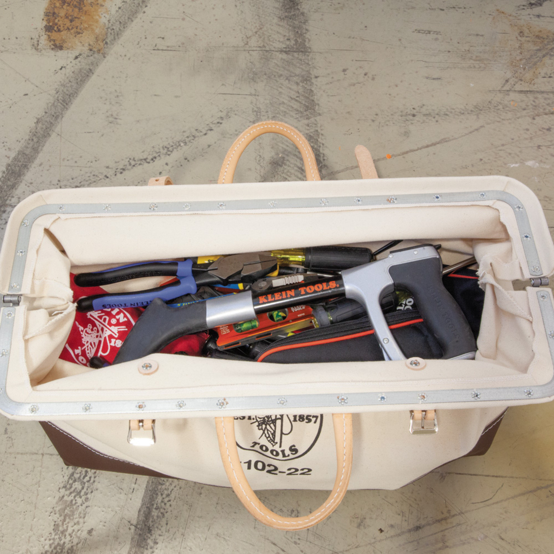 Durable No. 8 canvas with a moisture-resistant vinyl bottom, steel-reinforced frame, and riveted seams. Features a secure brass zipper and leather handles for a reliable, professional tool bag.