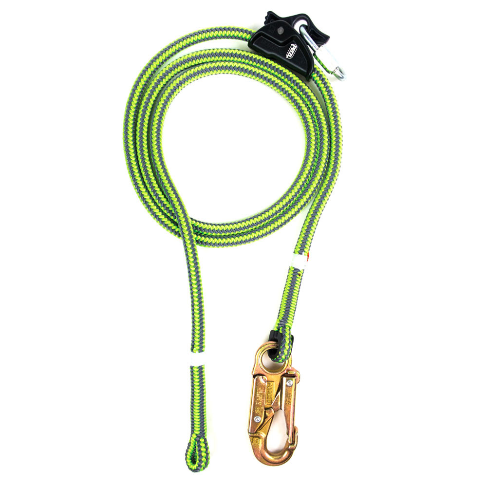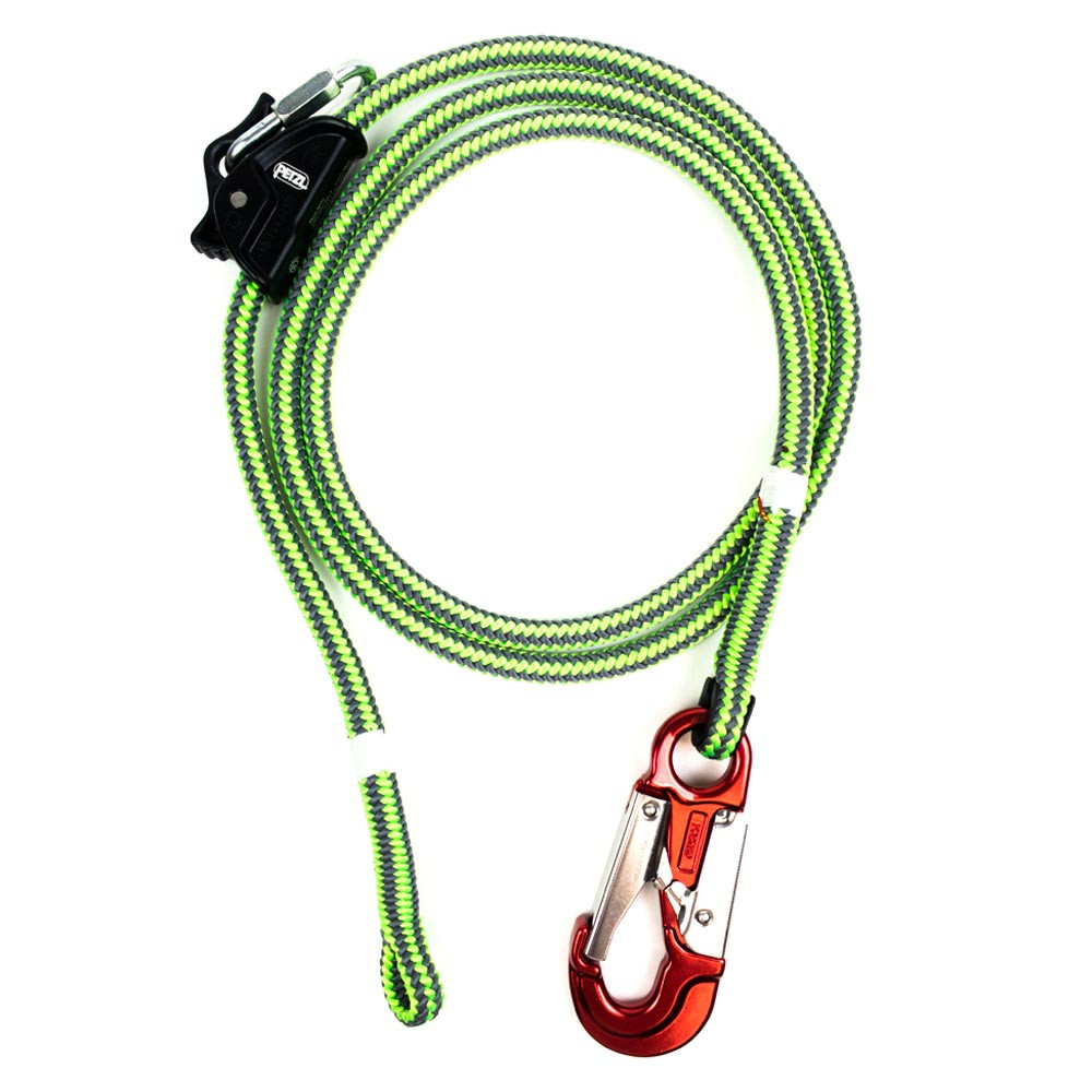 New updated 1/2" Microjuster Lanyard System with Steel or Aluminum Snap. Constructed of Samson's 16-Strand Hawkeye climbing line hand splice by the professionals at Rope Logic. This complete lanyard system uses Petzl's micrograb which is machined from a solid block of aluminum and features a grooved alloy cam that is not abrasive to the lanyard rope. System includes Petzl's rated screw link for attachment to your harness dee.