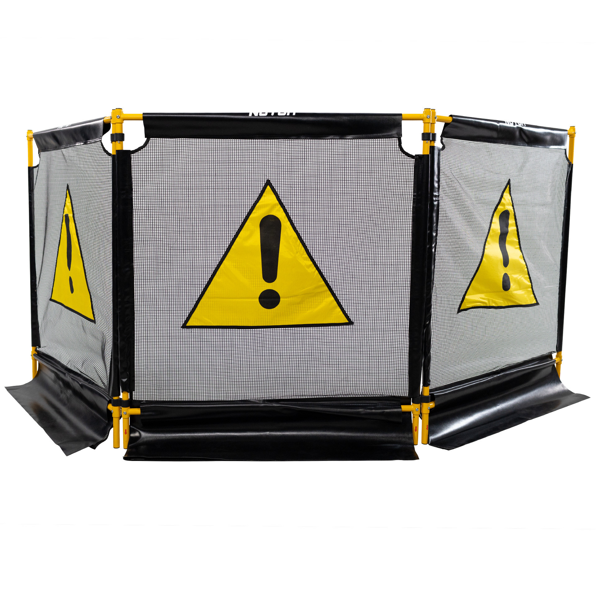 Secure your work zone with this durable three-panel system that helps minimize flying debris and keeps bystanders at a safe distance. The Tri Guard II features an updated design with improved structural stability that is stable on uneven terrain and in windy conditions. The durable mesh panels help contain chips and debris and minimizes cleanup time. The tri-folding construction makes it easy to stand up and put away and only needs to be assembled once.