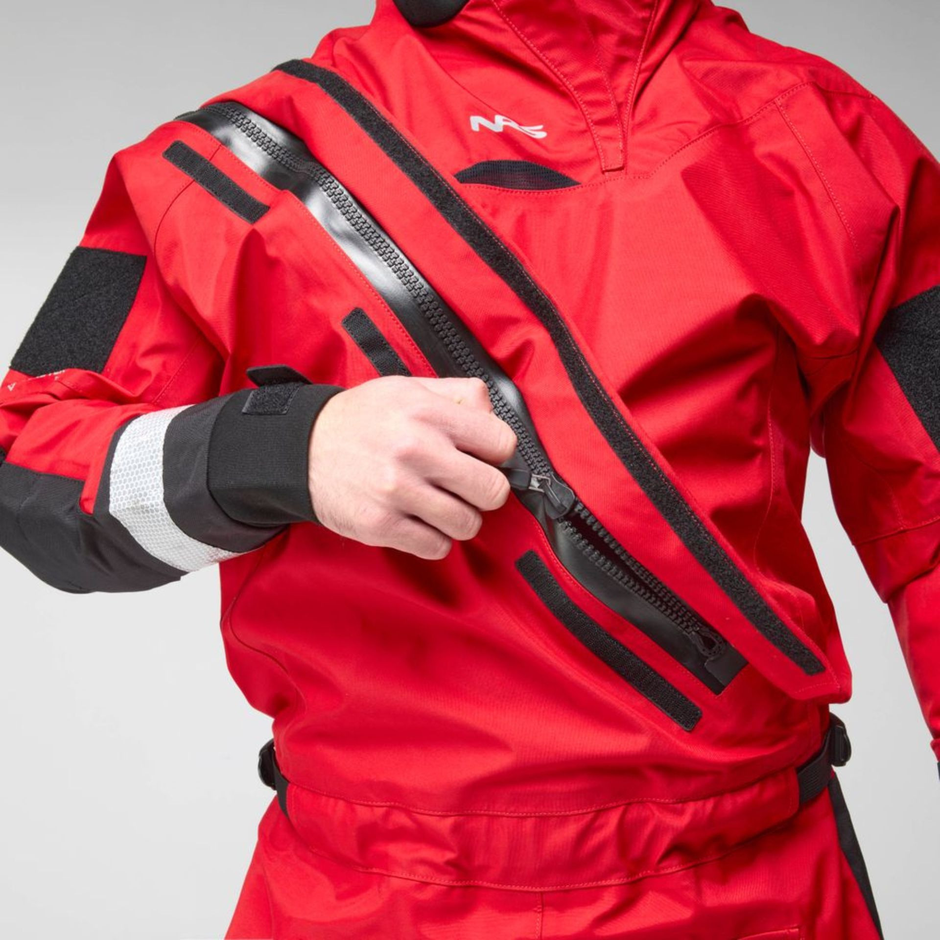 - Latex neck and wrist gasket feature a protective hook-and-loop overcuff.