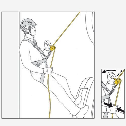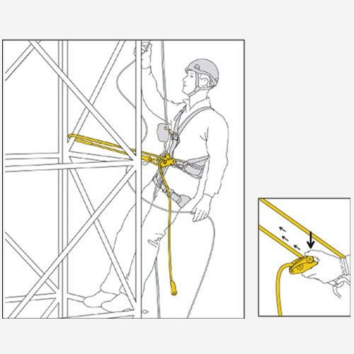 - Can be used in single mode on the harness ventral attachment point, to distribute weight between the waistbelt and the leg loops (user is suspended): length is adjusted by operating the handle while holding the free end of the lanyard