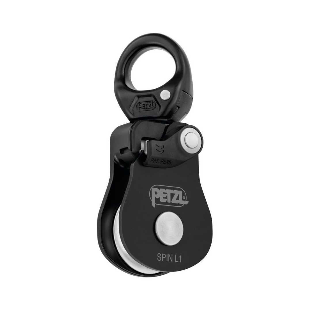 Openable even when attached to the anchor, the Petzl SPIN L1 pulley is designed for maximum simplicity in setting up hauling or load deviation systems, and tyroleans. The large diameter sheave mounted on sealed ball bearings gives it excellent efficiency. The swivel facilitates handling, allowing the pulley to be oriented under load, and direct connection of carabiners, ropes or slings.