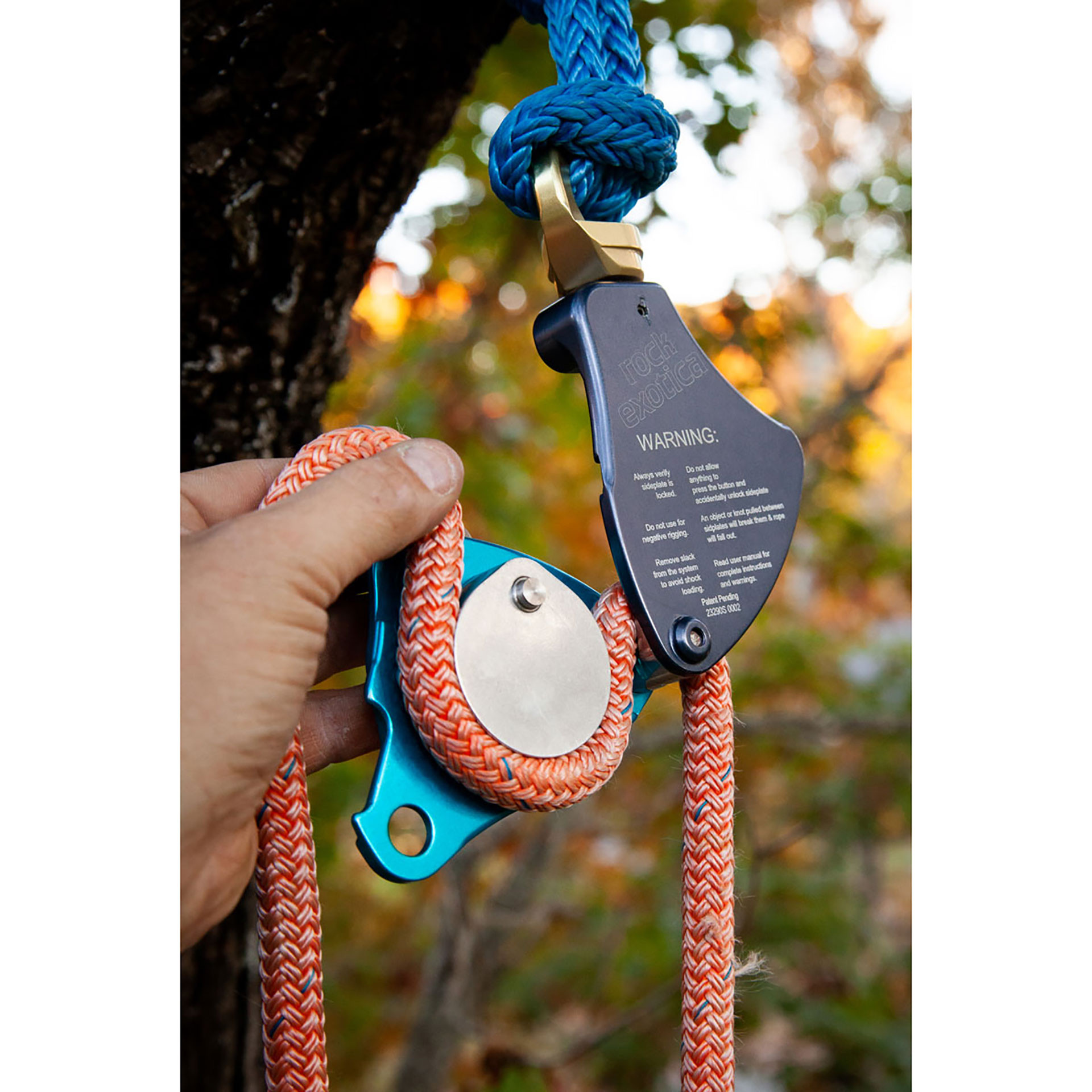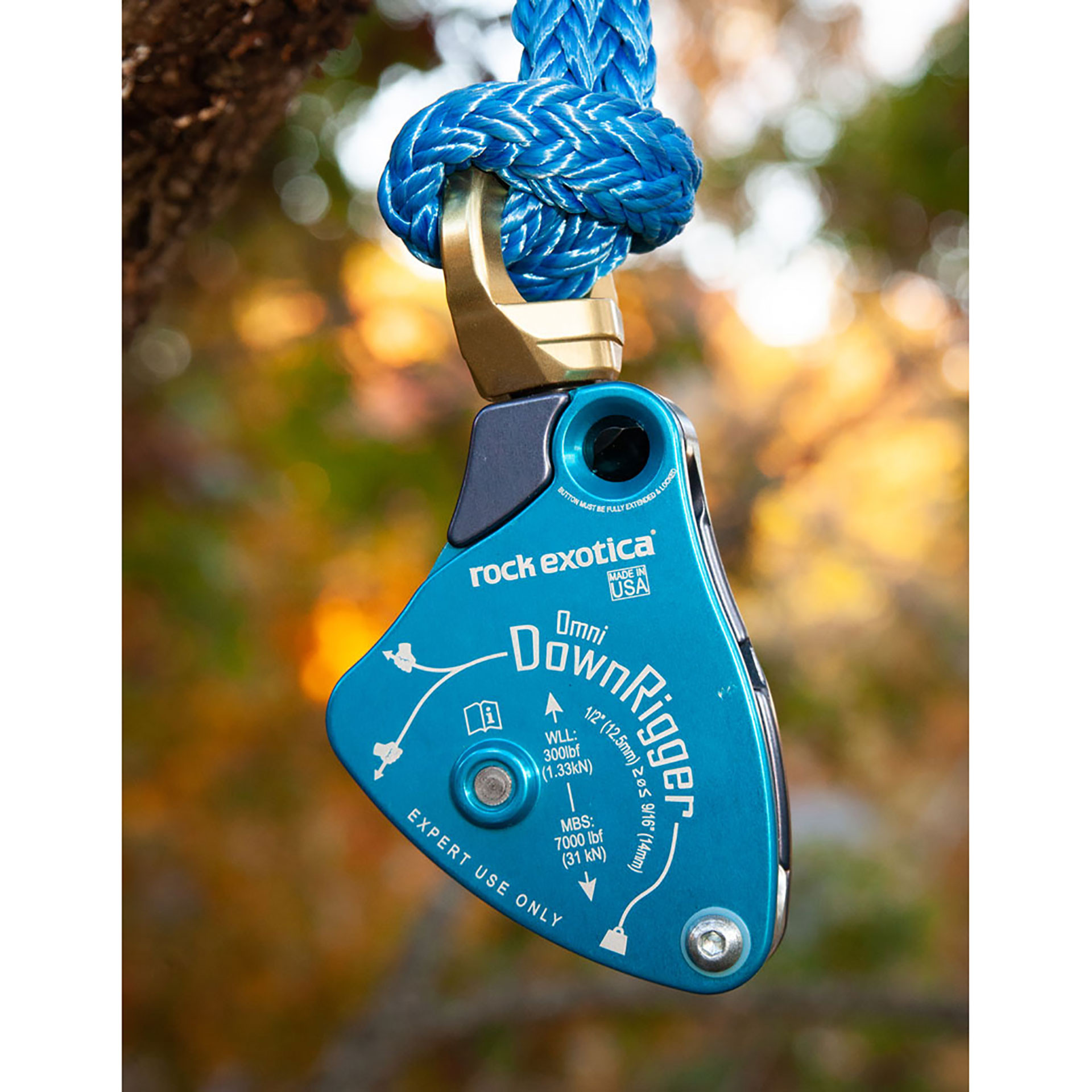 The DownRigger applies friction to the rigging line when weighted by the load, allowing the operator to control the descent by hand. Unweighted, the line pulls easily back through the device to reset the system. The DownRigger features the well-known Rock Exotica swivel top that allows for easy alignment with the load, and the double-locking side plate that makes rope installation more efficient.