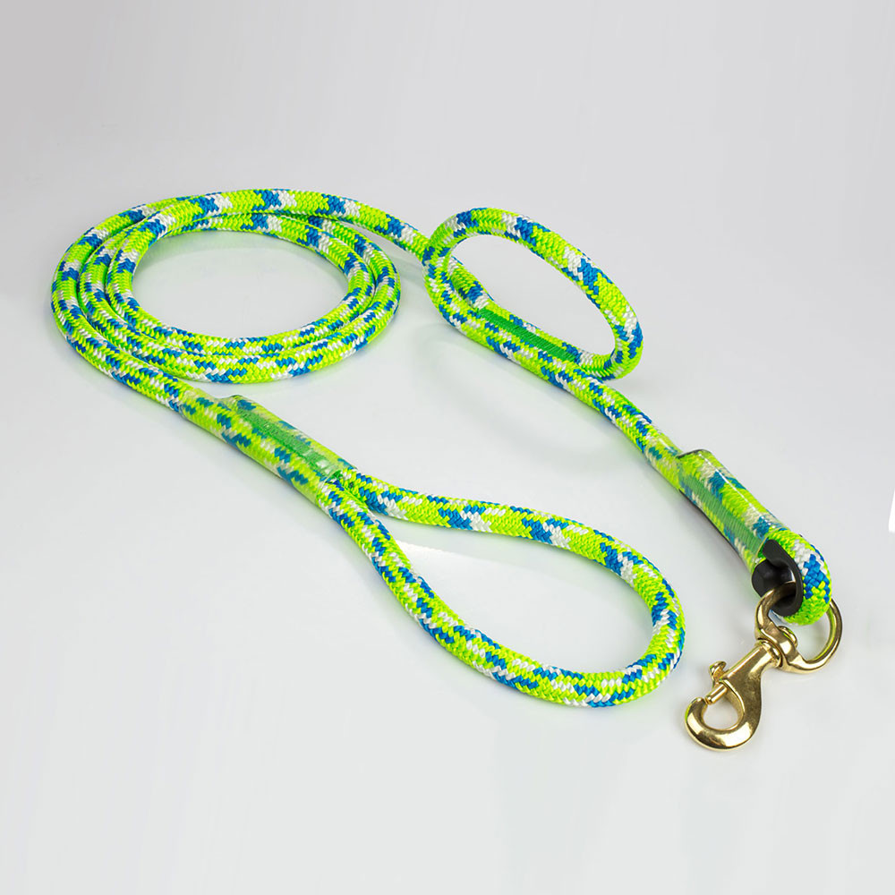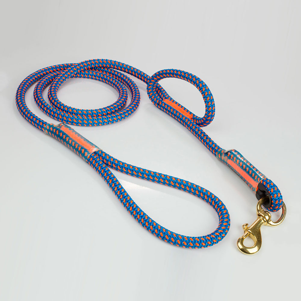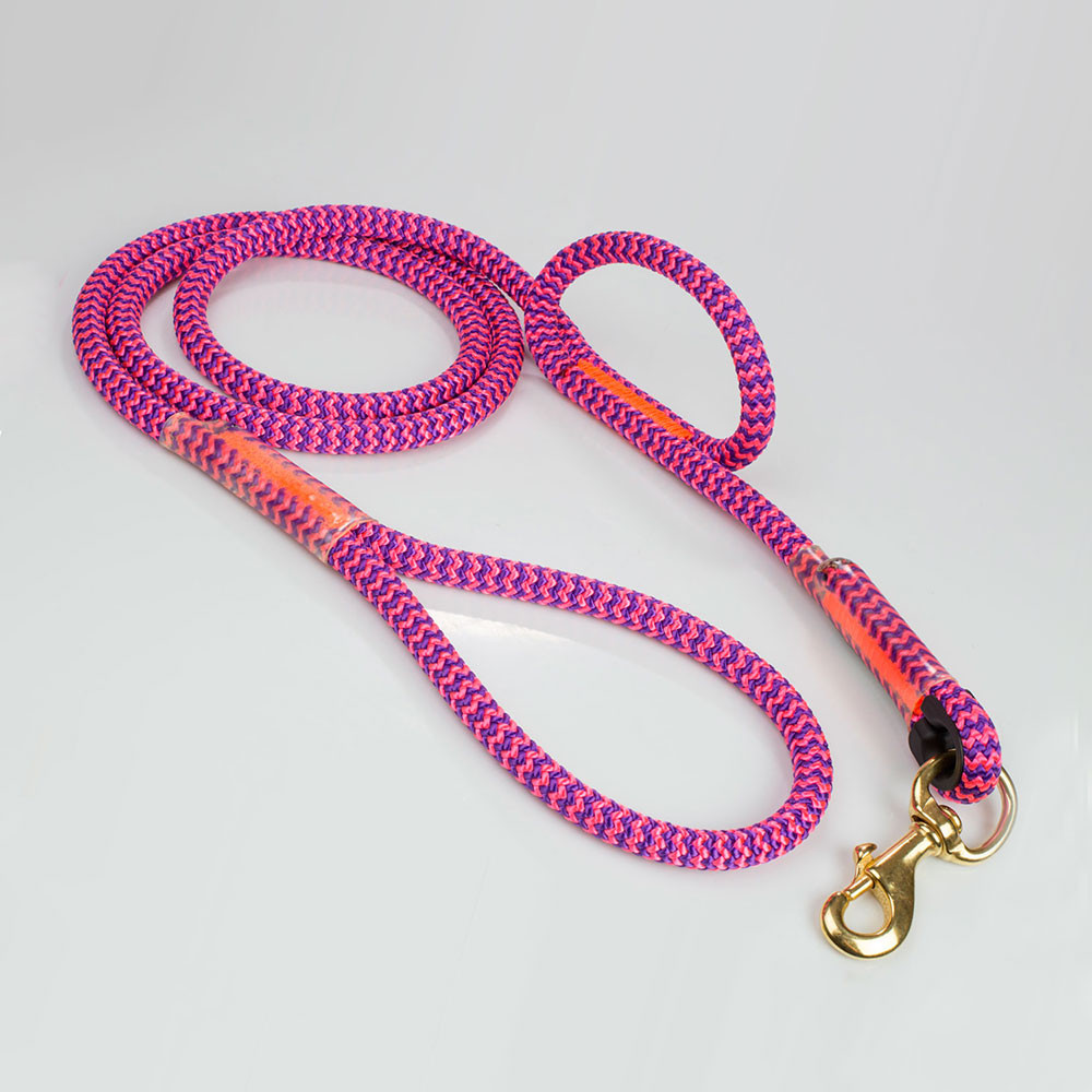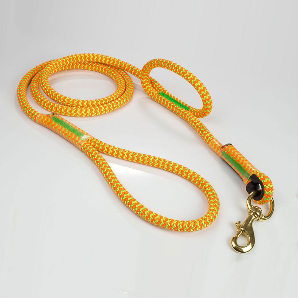 These 6' dog leashes are made with Calamine, Lava Orange, Lava Surge, Tendril Neon Green or Tropical Ivy climbing ropes. Which means it is TOUGH! These ropes are made to be used in trees in the worst conditions, so it will not only survive Mr. Bigglesworth's abuse but there is almost no way they are going to break it. The stitching is unique, the thread is thick and designed to be super abrasion resistant (not your mom's sewing thread). If you are looking for a leash that not only looks nice and will last a life time. But will also take a beating, then this leash is for you.
