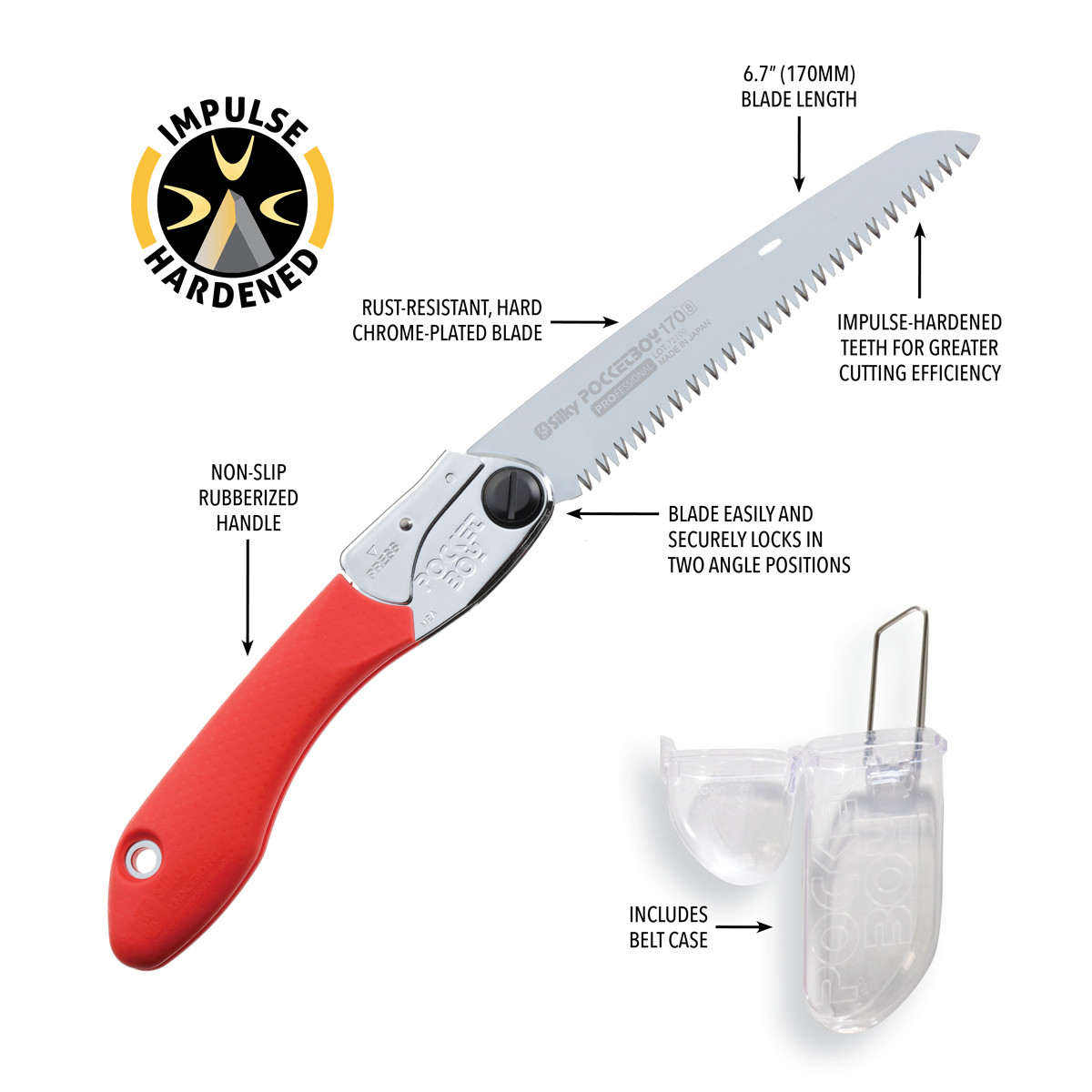 - Impulse hardened blade stay sharp three times longer than non-hardened teeth