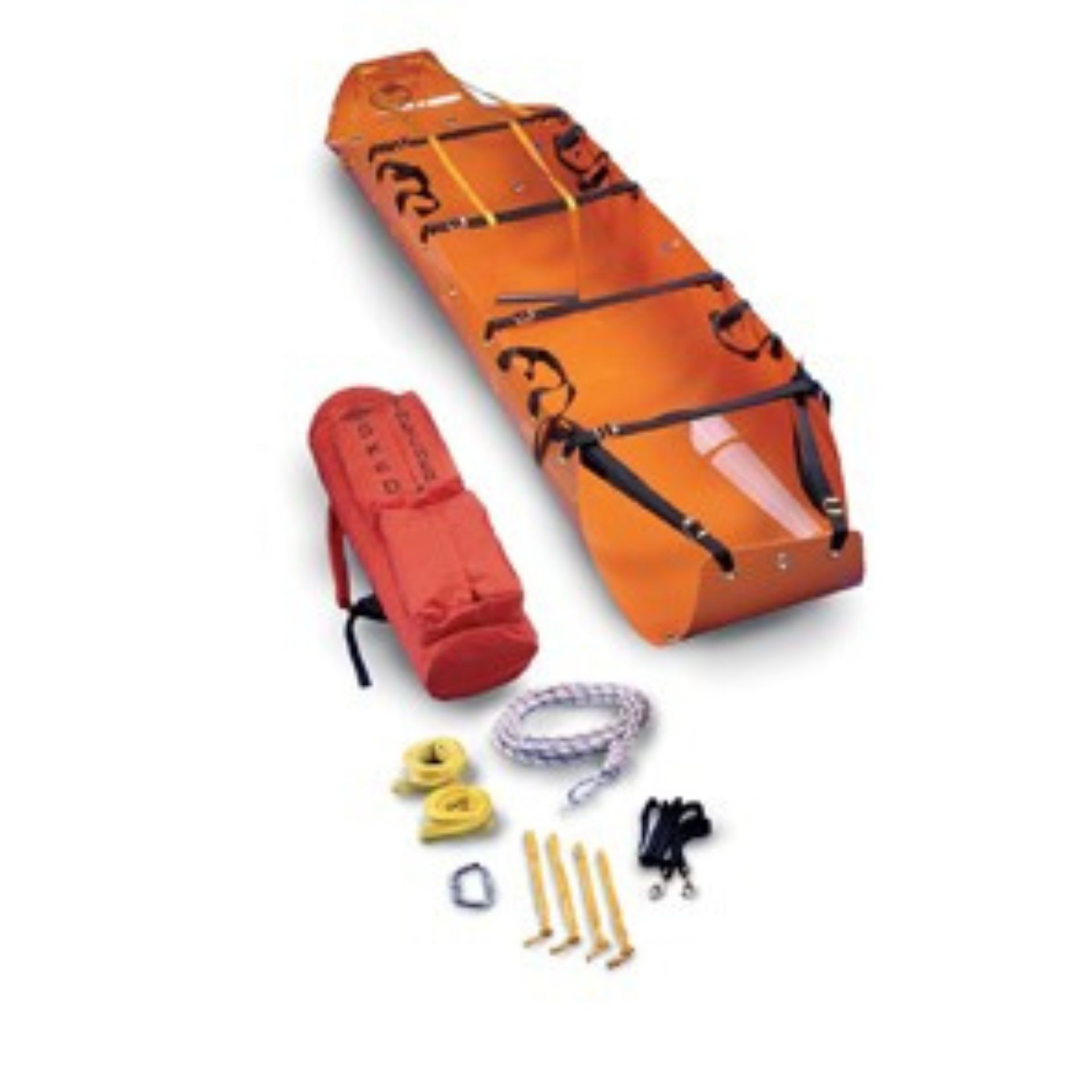 Made from a heavy sheet of plastic, the stretcher becomes rigid when folded around your patient. A variety of handles and straps allows the stretcher to be transported by carrying, lifting (vertically or horizontally) by rope systems or helicopter, or towed with the stretcher sliding on the smooth bottom surface. The system comes complete with the stretcher, Cordura® nylon backpack/towing harness, two straps, horizontal lift slings, vertical lift sling, one large steel carabiner, and four removable web handles. The Sked storage bag is 36 inches (91 cm) long by 9 inches (23 cm) in diameter.