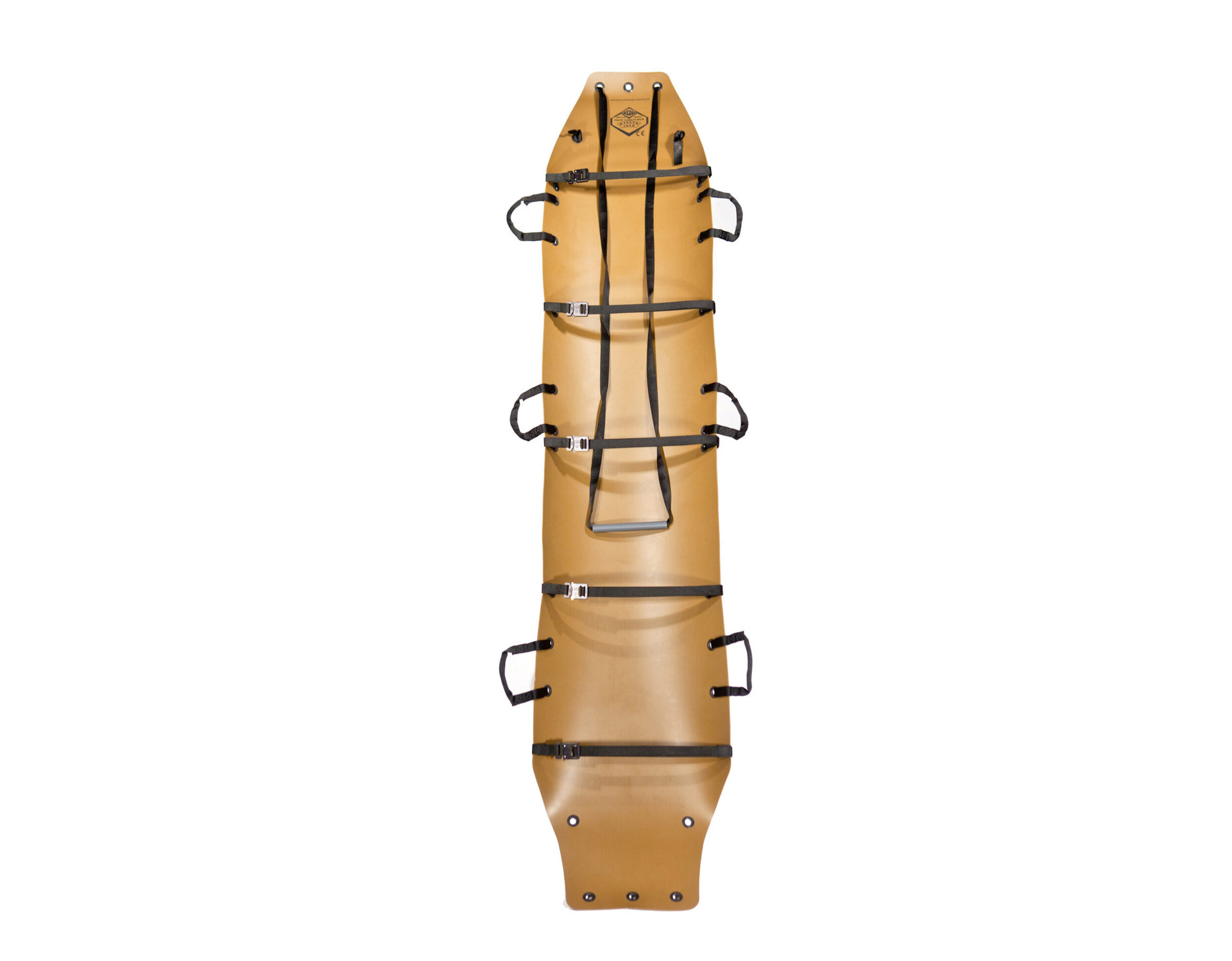 It has five cross straps that fasten with COBRA® buckles, six carrying handles (sewn on), and a 12 foot long rope with a plastic tube handle for dragging. The rope can be adjusted to shorter lengths by pulling it farther through the grommets and tying the overhand knots farther from the ends of the rope. The Ranger Sked is rolled up for storage with a retainer strap to keep it rolled.