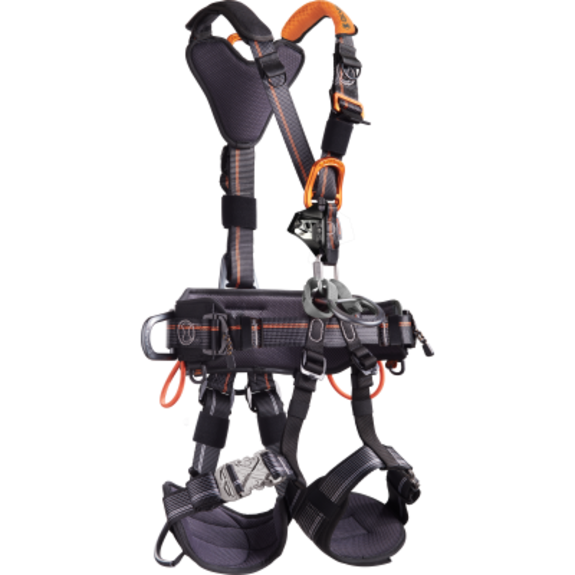 - HARNESS FEATURES: Adjustable leg loop fixation, Fall indicator, Integrated chest ascender, Lanyard parking ring