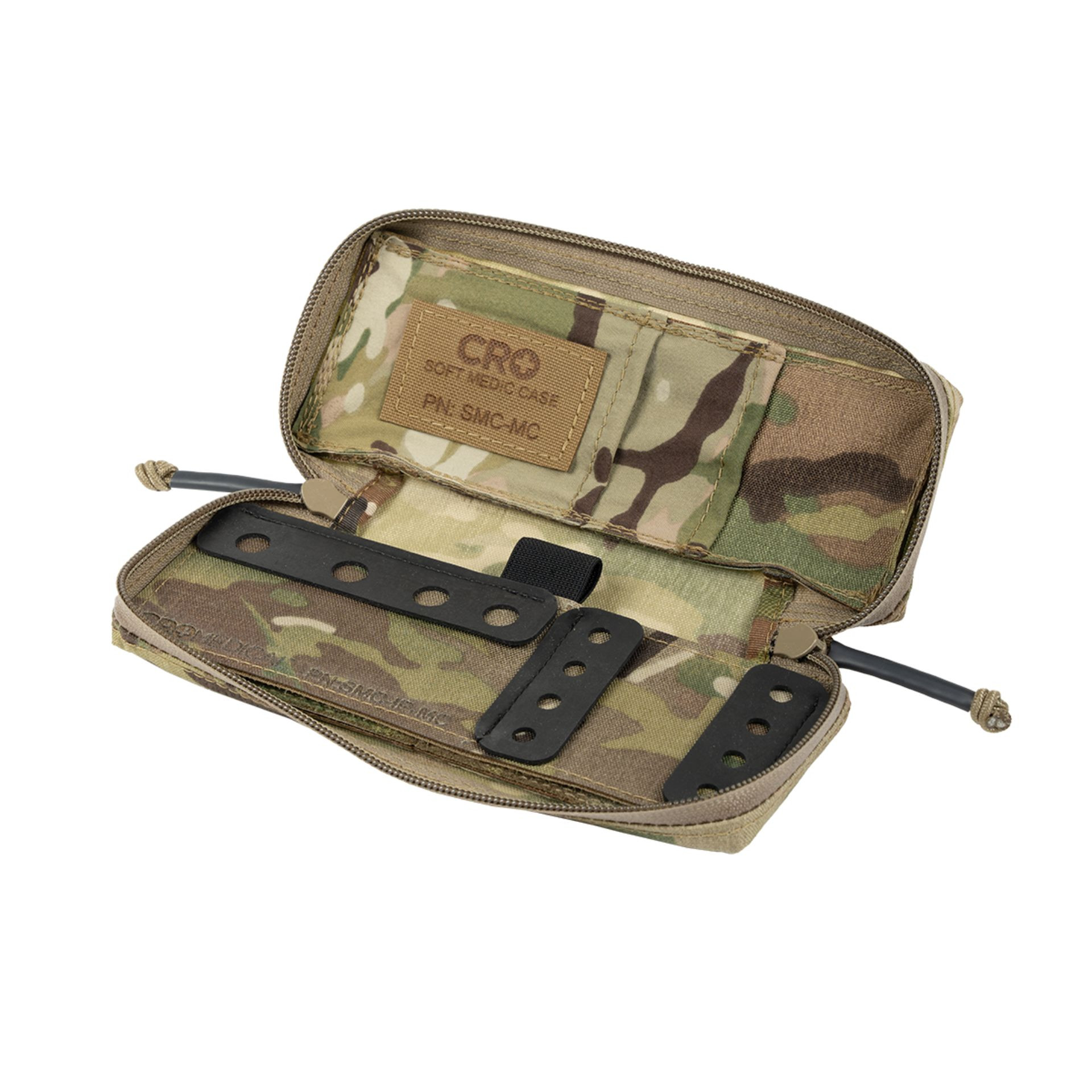 Designed for POI med carry. Doesn’t hold the kitchen sink, but good for medics who have multiple setups. The CRO Soft Medication Case includes a customizable loop panel for Velcro “dot” vial retention. The organizing sleeves in the lid are designed for a few syringes, needles, swabs, atomizers, etc. Low-profile tether attachment so you can secure it to your kit. That’s it, it’s a med case, just smaller.