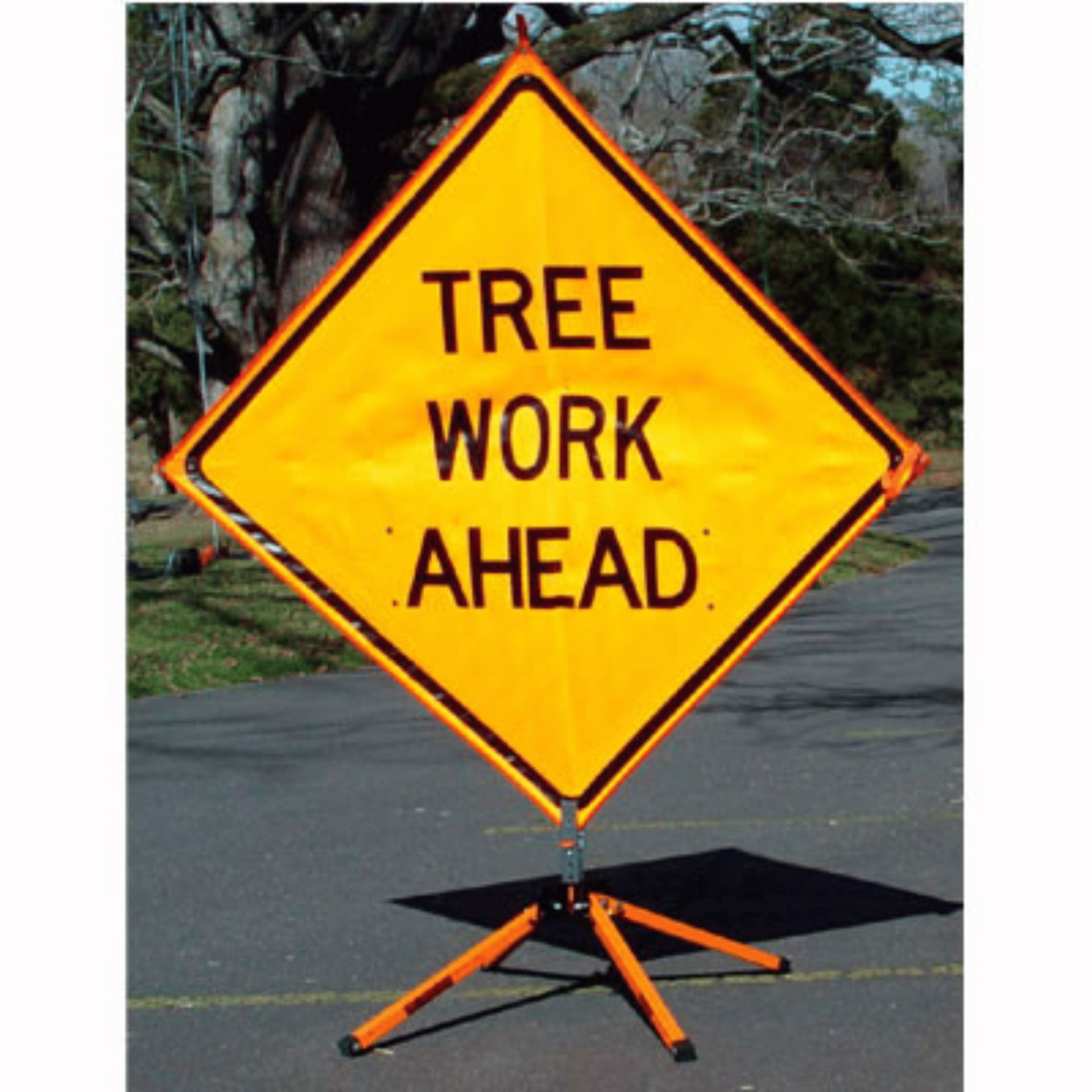 This Tree Work Ahead sign from Dicke Tool includes a rugged 2" sign stand. The stand displays roll-up signs 12" off the ground and feature foot-actuated kick releases with three locking positions for storage and stability on uneven terrain. Available: in size 36" sign.